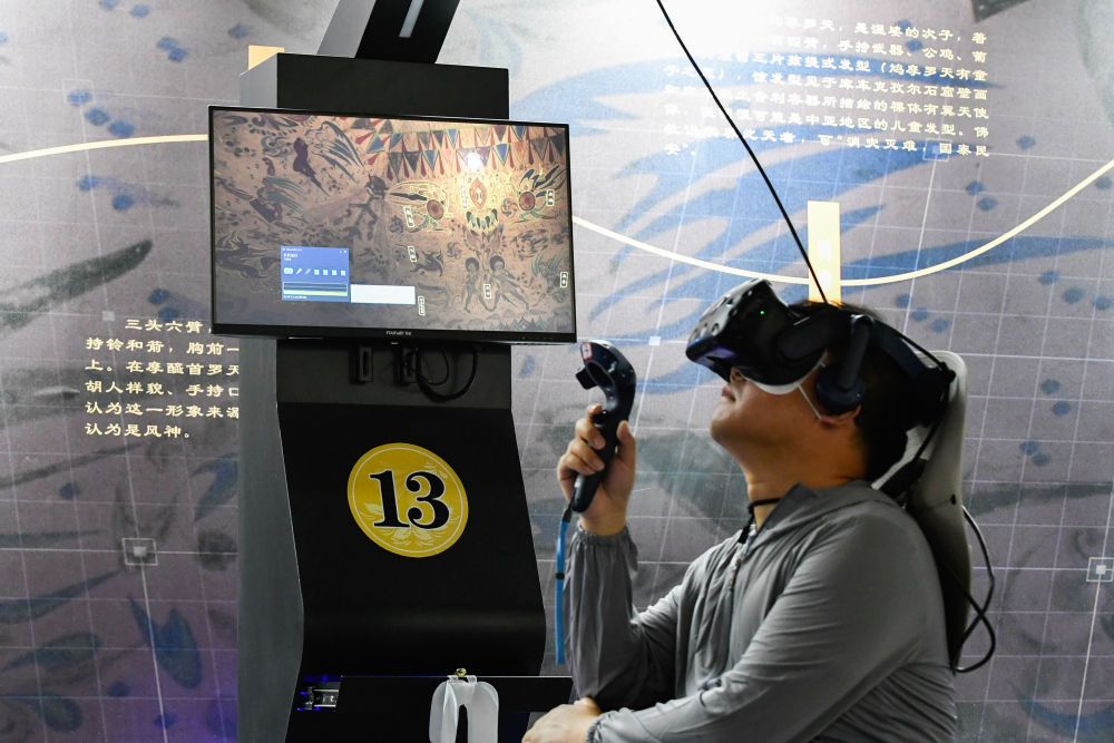 2024年7月22日,一名游客在敦煌莫高窟“尋境敦煌——數(shù)字敦煌沉浸展”上借助VR設(shè)備沉浸式游覽莫高窟第285窟虛擬場(chǎng)景。“尋境敦煌”綜合運(yùn)用了VR虛擬現(xiàn)實(shí)、三維建模、游戲引擎的物理渲染和全局動(dòng)態(tài)光照等新技術(shù),高精度立體還原了莫高窟第285窟。游客戴上VR眼鏡,不僅可以零距離觀賞壁畫、360度自由探索洞窟細(xì)節(jié),還能“飛升”到窟頂,身臨其境參與壁畫故事情節(jié),沉浸式感受敦煌文化的魅力。