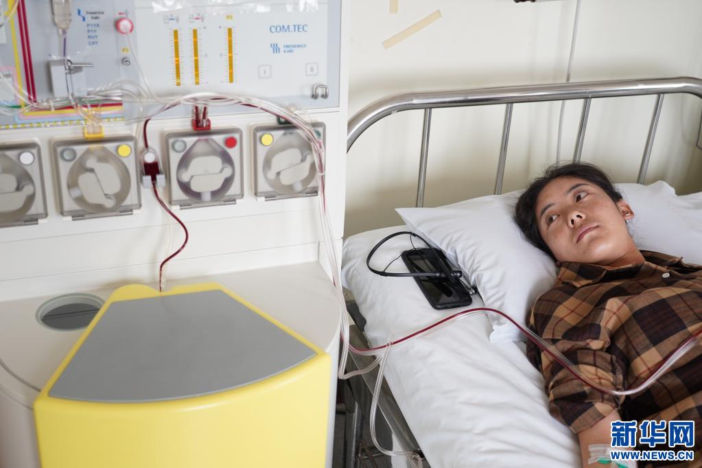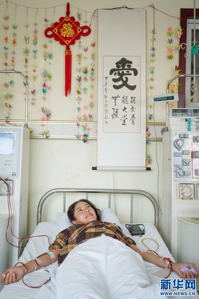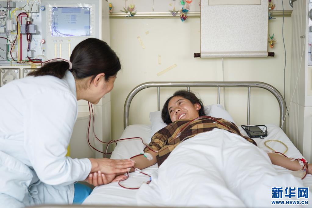 醫(yī)生摸著拉增的手和她聊天,造血干細(xì)胞整個(gè)采集時(shí)間需要近4個(gè)小時(shí)(資料圖片)。新華社記者 彭子洋 攝
