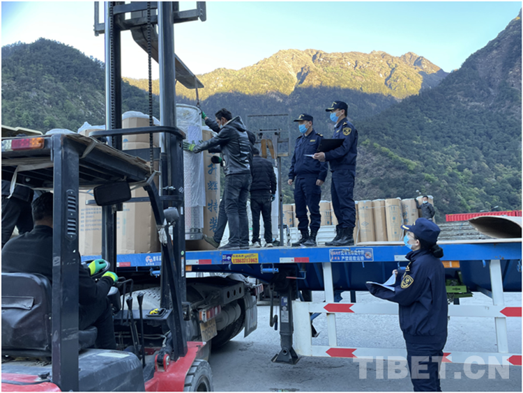 圖為聶拉木海關(guān)關(guān)員正在對(duì)援尼物資進(jìn)行現(xiàn)場監(jiān)管