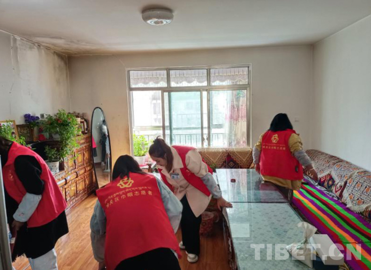 圖為社區(qū)志愿者們?cè)谛袆?dòng)不便的老人家里打掃衛(wèi)生