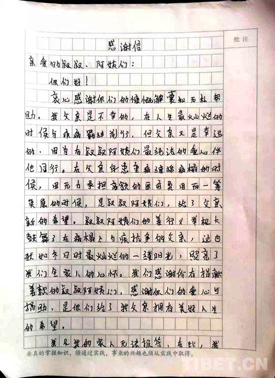 中國(guó)西藏網(wǎng)訊 “親愛(ài)的叔叔、阿姨們,您們好,衷心感謝你們的慷慨解囊和無(wú)私幫助......!”近日,西藏自治區(qū)林芝市巴宜區(qū)更章門巴民族鄉(xiāng)(以下簡(jiǎn)稱:更章鄉(xiāng))門仲村村民西繞多吉女兒達(dá)娃玉珍向更章鄉(xiāng)新時(shí)代文明實(shí)踐所發(fā)來(lái)了一封感謝信,字里行間充滿著感激之情,而背后的暖心故事更讓人溫暖與感動(dòng)。