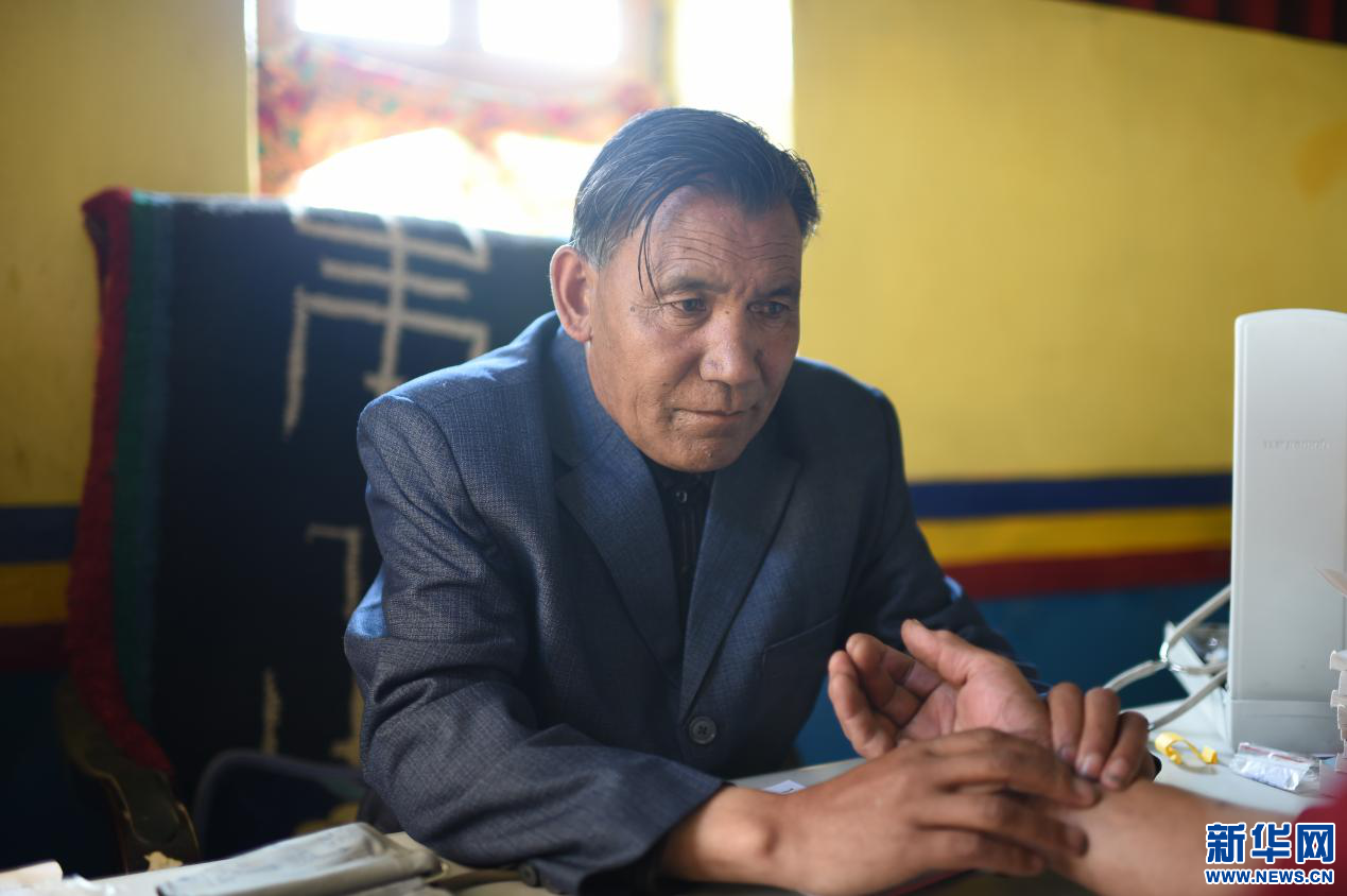 圖為西藏阿里岡底斯藏醫(yī)教學(xué)院校長(zhǎng)才丹多吉在為患者把脈(4月20日攝)。新華網(wǎng) 旦增努布攝
