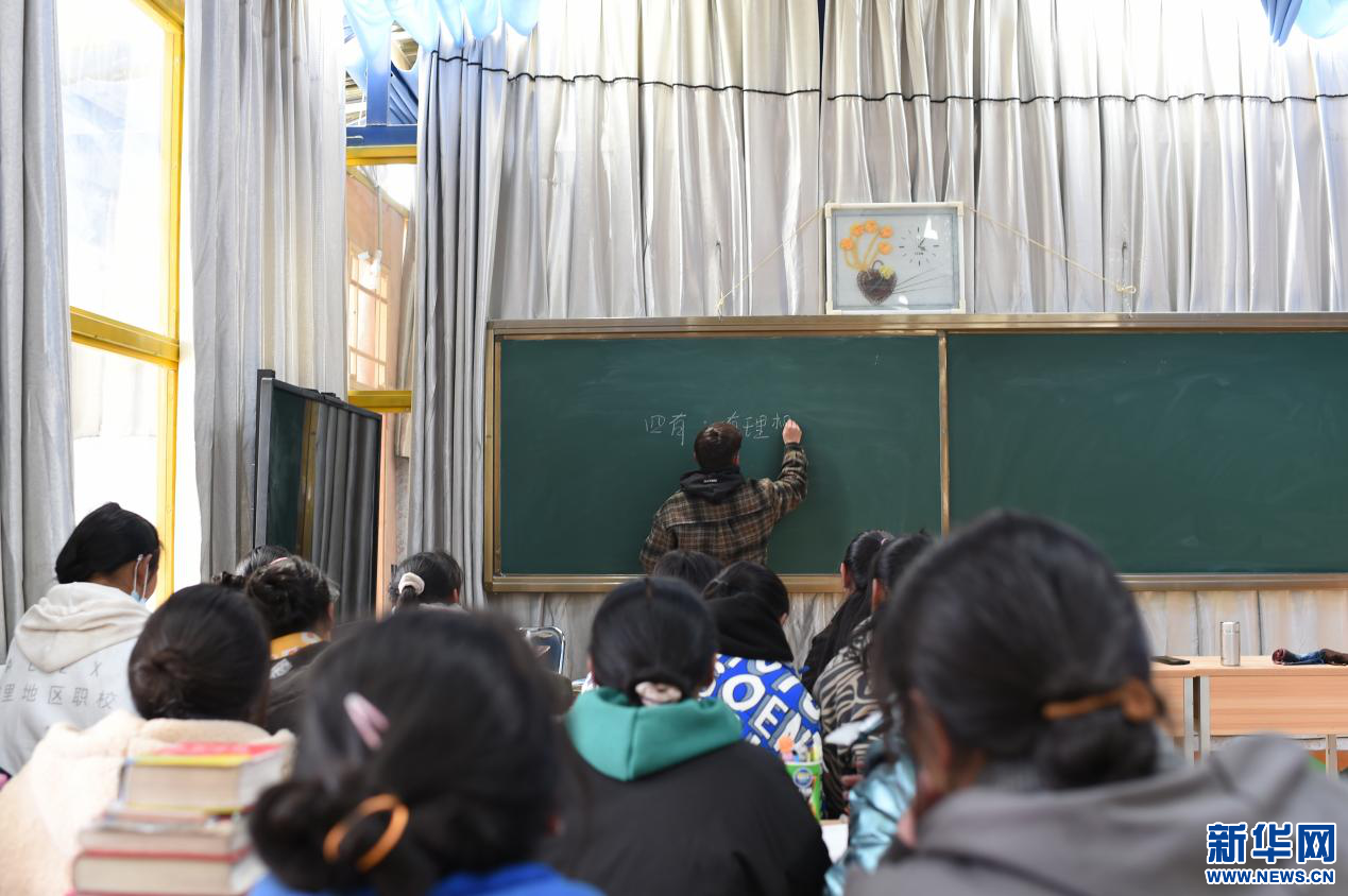 在西藏阿里岡底斯藏醫(yī)教學(xué)院,學(xué)生們?cè)谏险n(4月20日攝)。新華網(wǎng) 旦增努布攝
