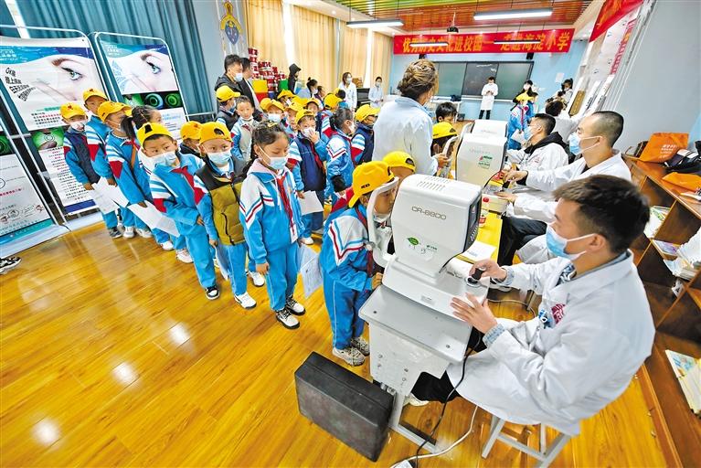 圖為醫(yī)護人員利用專業(yè)儀器為學生開展視力檢查。記者 唐斌 攝