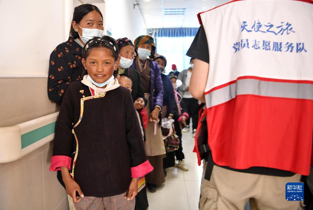 7月9日,西藏山南市浪卡子縣的兒童在家長陪伴下到縣人民醫(yī)院接受先心病篩查。新華社記者 張汝鋒 攝