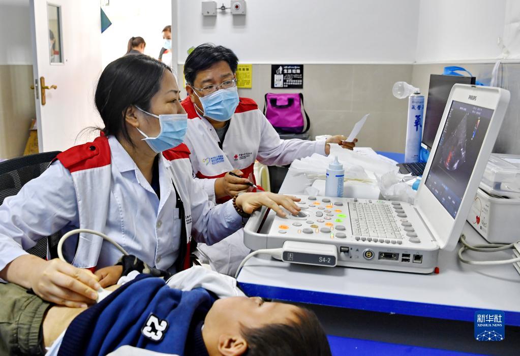 7月9日,在西藏山南市浪卡子縣人民醫(yī)院,來自鄭州市第七人民醫(yī)院的主任醫(yī)師張潤生(右)和彩超室主任于慧娟(左)在為一名兒童做檢查。新華社記者 張汝鋒 攝