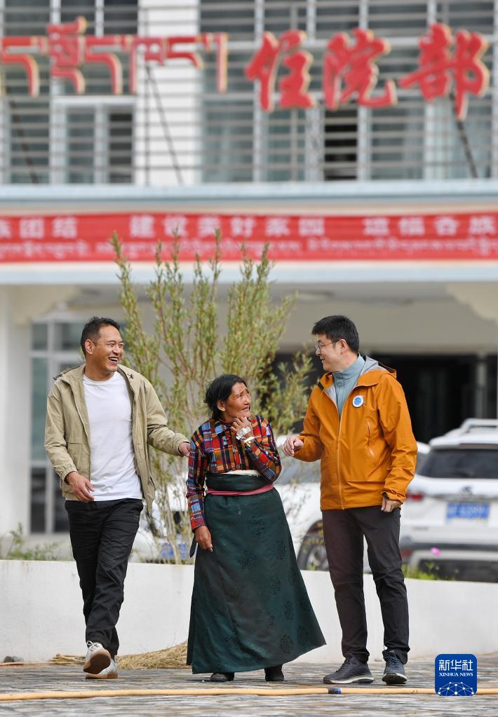 7月31日,在阿里地區(qū)人民醫(yī)院,中國醫(yī)學科學院整形外科醫(yī)院醫(yī)生王克明(右)和西藏自治區(qū)人民醫(yī)院醫(yī)生旦增念扎(左)陪伴即將做手術(shù)的牧民巴吉放松散步。新華社記者 張汝鋒 攝