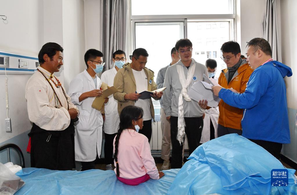 7月29日,在阿里地區(qū)人民醫(yī)院,醫(yī)生們?yōu)榇诫窳鸦颊邥\。新華社記者 張汝鋒 攝