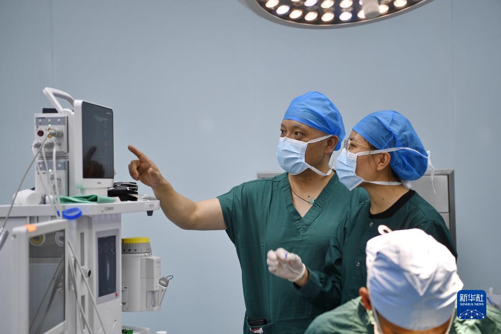 7月31日,在阿里地區(qū)人民醫(yī)院手術(shù)室,西藏自治區(qū)人民醫(yī)院麻醉科醫(yī)生達娃吾珠(左一)指導當?shù)芈樽磲t(yī)生旦增次白進行麻醉監(jiān)測。新華社記者 張汝鋒 攝