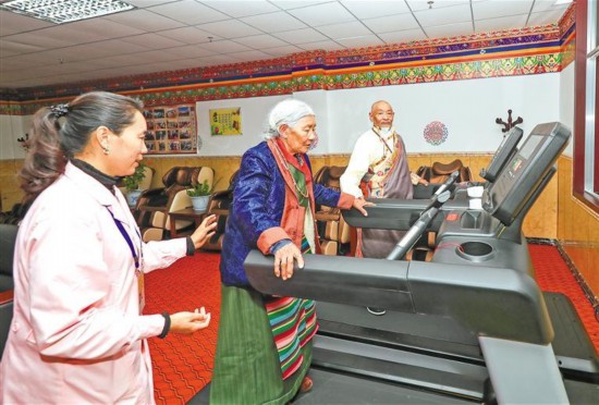 圖為在阿里地區(qū)噶爾縣老人集中供養(yǎng)中心,農(nóng)村特困老人在工作人員指導(dǎo)下進行運動。記者 格桑吉美 攝