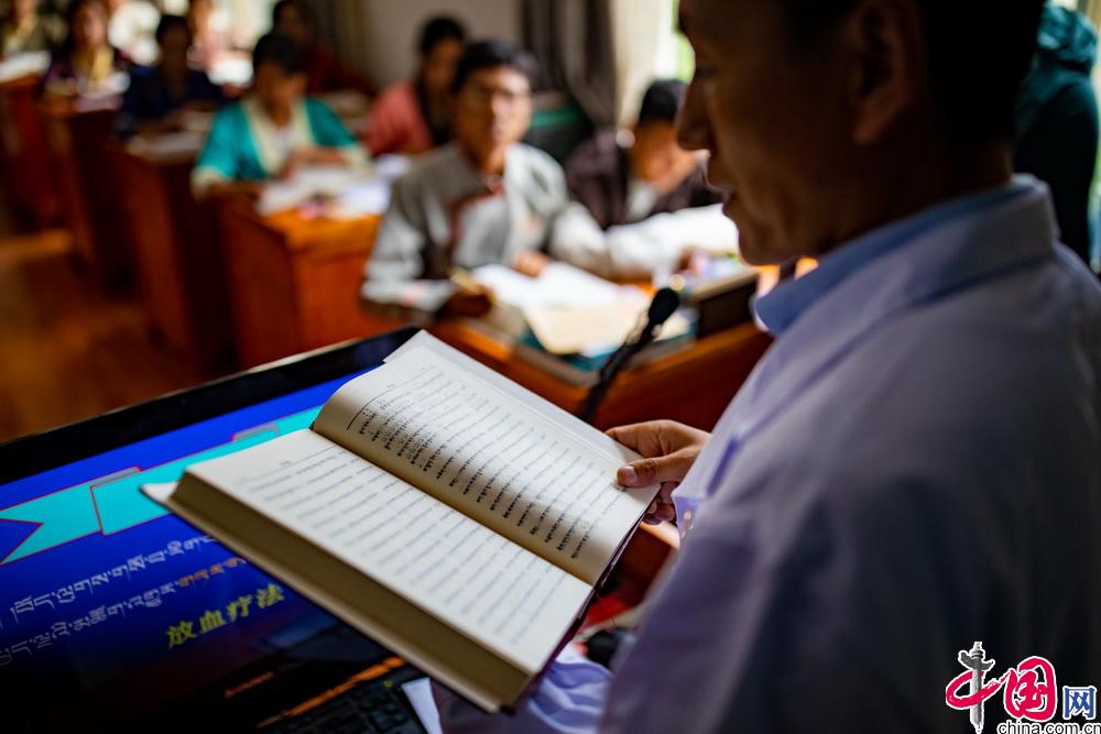 西藏藏醫(yī)藥大學開設特色鮮明的藏醫(yī)藥學唐卡教學課程?,F(xiàn)有醫(yī)學唐卡由十七世紀藏醫(yī)藥大家第司.桑杰嘉措創(chuàng)建,距今已有300多年的歷史。醫(yī)學唐卡用歸納、總結的方式將藏醫(yī)藥典籍《四部醫(yī)典》的主要內容以“樹喻”方式繪示出來。成書于1300多年的《四部醫(yī)典》是藏醫(yī)藥學理論的根本大典。包括總則醫(yī)典、論述醫(yī)典、秘訣醫(yī)典和后續(xù)醫(yī)典。內容涵蓋藏醫(yī)生理學、病理學、診斷學、治療學等基礎理論,細化了婦科、兒科、內科、外傷等學科,包含了解剖學、護理學、藥學等眾多學科。圖為學校老師在對醫(yī)學唐卡進行講解。中國網記者 鄭亮攝