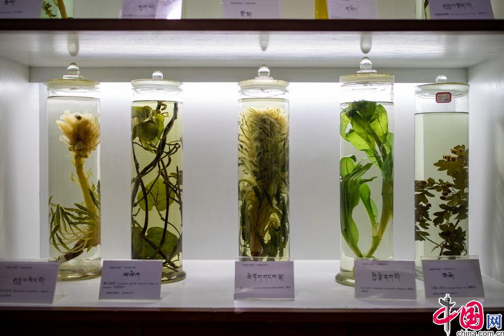 學校目前在藏藥新藥研發(fā)方面正在進行“四臣止咳液”、“降糖靈”、“清血康”等藏藥的研發(fā),同時研發(fā)出了藏藥牙膏、藏藥面膜等延伸產品。在藥材種植方面,積極開展了瀕危藏藥材的種植攻關工作,先后對喜馬拉雅紫茉莉、 船形烏頭、紅景天等瀕危藏藥通過項目進行育苗、種植等。圖為西藏藏醫(yī)藥大學內所陳列的藏藥標本。中國網記者 鄭亮攝