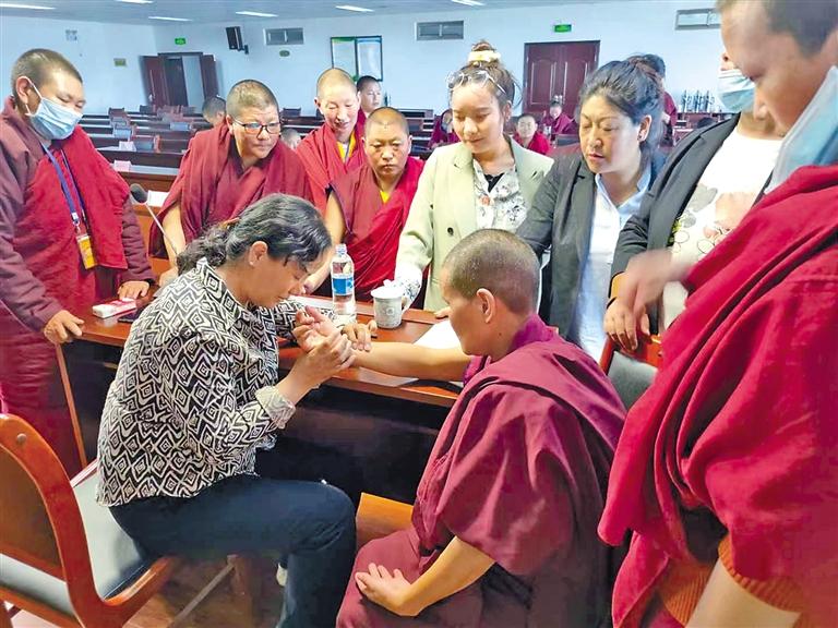 圖為明吉措姆教授在基層為僧尼群眾號(hào)脈。