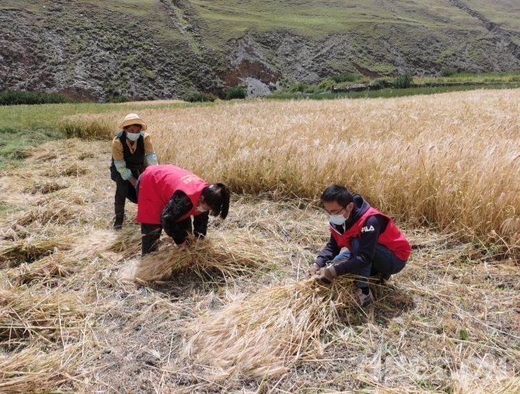 圖為閆磊(右一)幫助困難戶秋收。
