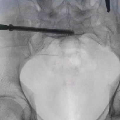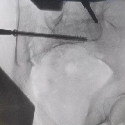 圖為透視下見置入的骶髂螺釘,位置、長度精準,無絲毫偏差