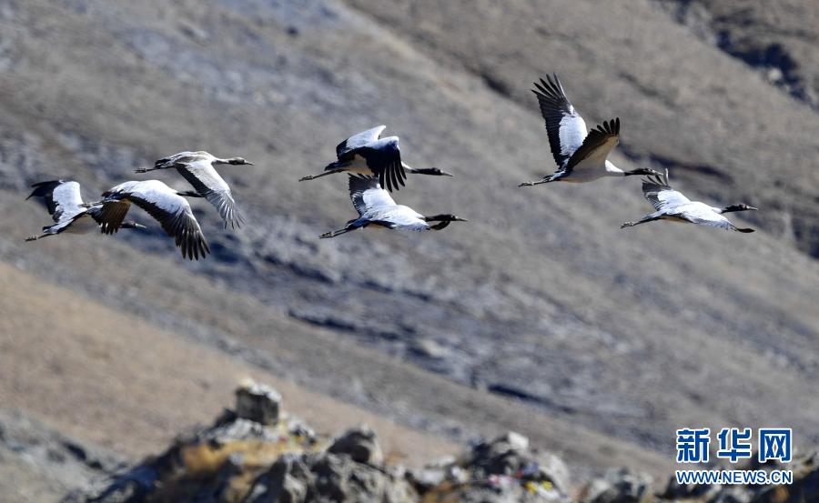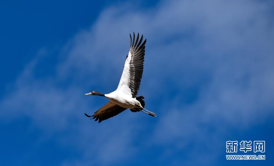 黑頸鶴在林周縣黑頸鶴自然保護(hù)區(qū)上空飛翔(12月12日攝)。新華社記者 黃豁 攝