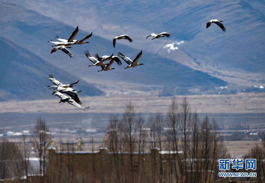 飛翔在林周縣黑頸鶴自然保護(hù)區(qū)上空的黑頸鶴集群(12月12日攝)。新華社記者 黃豁 攝