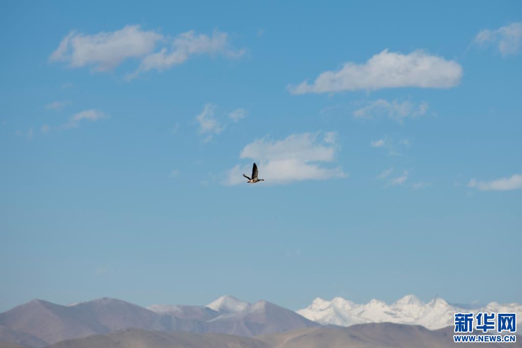5月16日,在西藏仲巴縣里孜口岸附近,一只斑頭雁從空中飛過(guò)。新華社記者 孫瑞博 攝