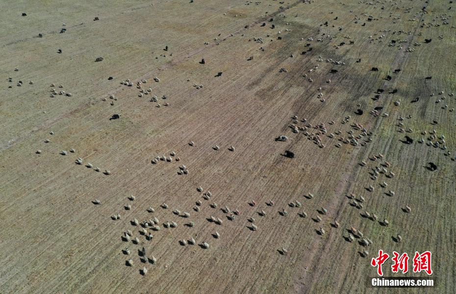 圖為瓊穆崗嘎雪山腳下成群結(jié)隊(duì)的牛羊。(無(wú)人機(jī)照片) 貢嘎來(lái)松 攝