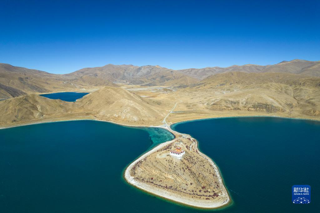 這是11月16日拍攝的羊卓雍措和坐落在湖畔的日托寺(無人機照片)。新華社記者 孫瑞博 攝