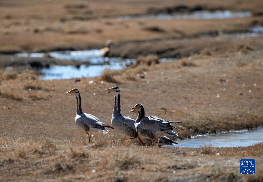 斑頭雁在羊卓雍措岸邊的濕地棲息(11月16日攝)。新華社記者 孫非 攝