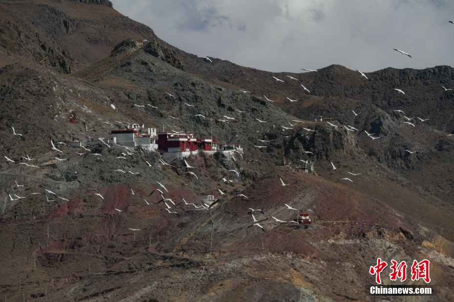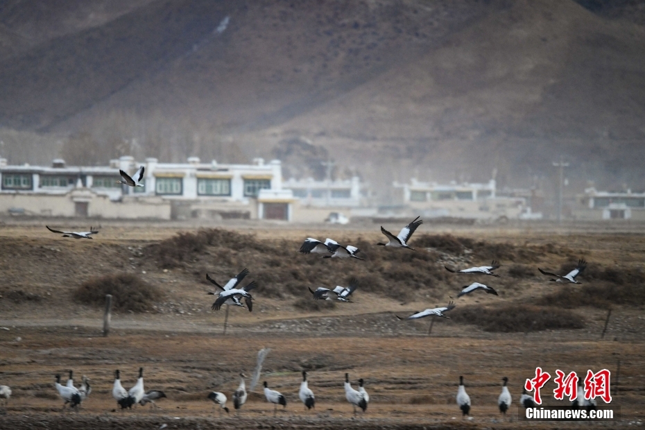 11月23日,在西藏自治區(qū)拉薩市林周縣境內(nèi),飛翔的黑頸鶴群。由于適宜的環(huán)境和充足的食物,冬季的拉薩市林周縣成了越來(lái)越多黑頸鶴聚集的家園。中新社記者 貢嘎來(lái)松 攝