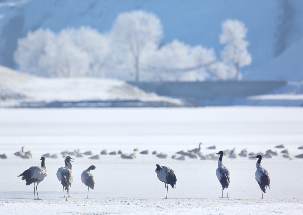 近日,西藏拉薩市林周縣迎來降雪,位于林周縣境內(nèi)的黑頸鶴保護(hù)區(qū)變成了粉妝玉砌的世界,黑頸鶴與白皚皚的大雪相互點綴,構(gòu)建出一幅自然和諧的冬日畫卷。