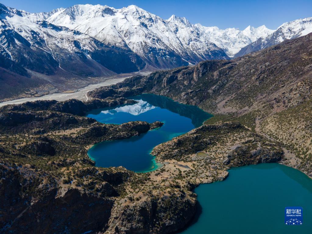 黑湖映射出雪山的倒影(4月2日攝,無人機照片)。新華社記者 周荻瀟 攝