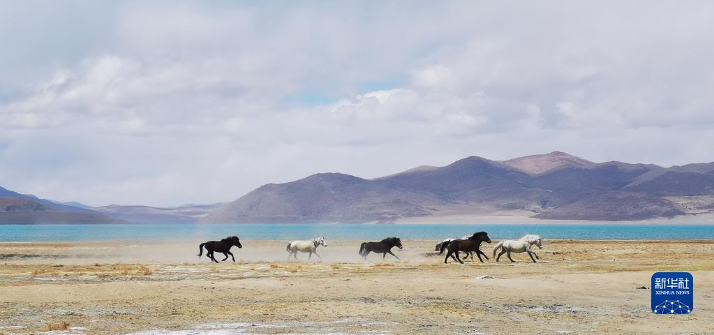 馬群在位于西藏自治區(qū)日喀則市聶拉木縣境內(nèi)的佩枯錯旁奔跑(2021年5月14日攝,手機照片)。新華社記者 沈虹冰 攝