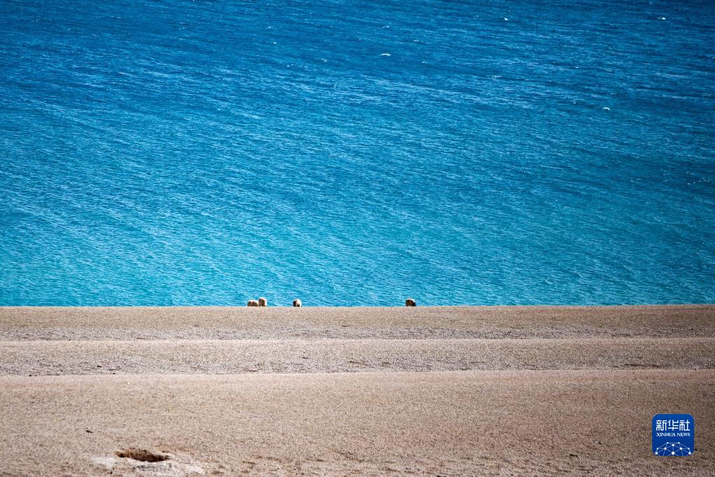 在位于西藏自治區(qū)那曲市的巴木錯,羊群在湖邊吃草(2022年4月13日攝,手機照片)。新華社記者 沈虹冰 攝