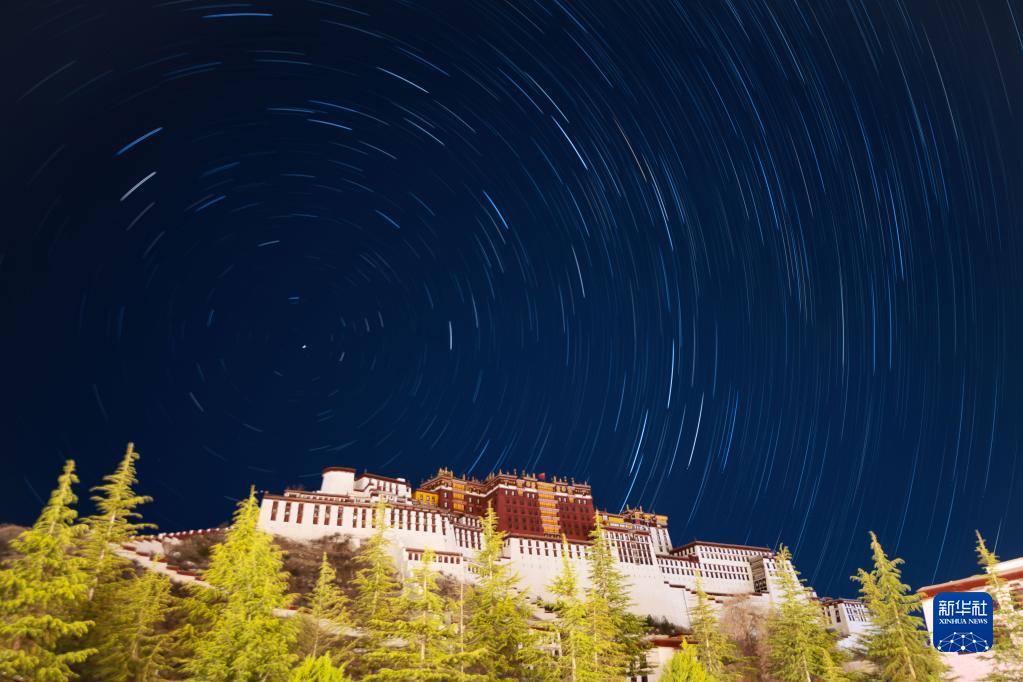 5月4日在拉薩市布達拉宮前拍攝的星軌(合成照片)。新華社記者 周荻瀟 攝