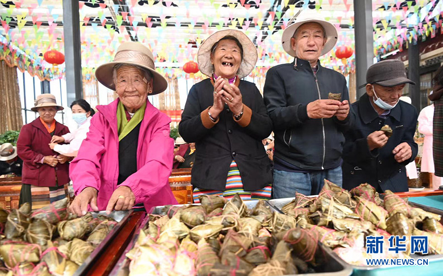 6月3日,在西藏山南市集中供養(yǎng)服務中心,老人們品嘗美味的粽子。新華網發(fā)(許國 攝)