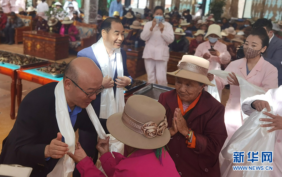 6月3日,西藏山南市集中供養(yǎng)服務中心內,老人向安徽第七批援藏工作隊的隊員獻上潔白的哈達。新華網 王雷 攝