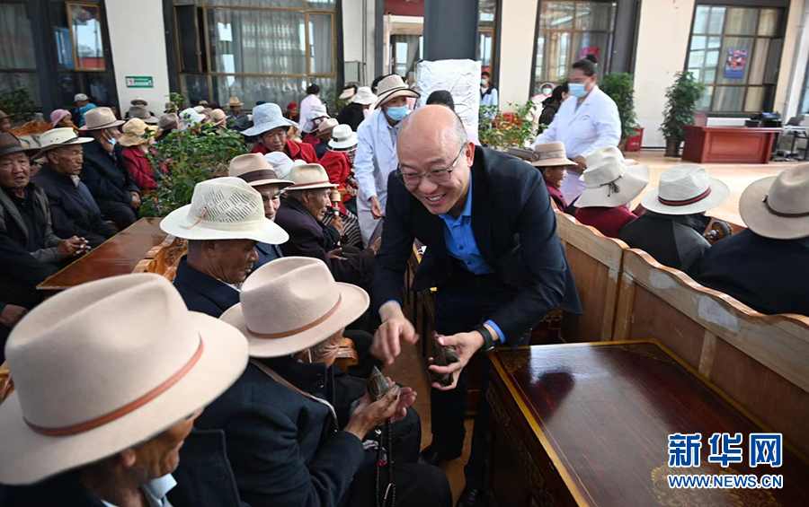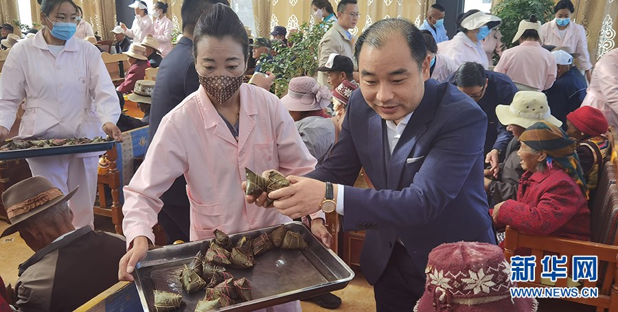 6月3日,在西藏山南市集中供養(yǎng)服務中心,安徽第七批援藏工作隊隊長汪華東為孤寡老人送上粽子。新華網 王雷 攝