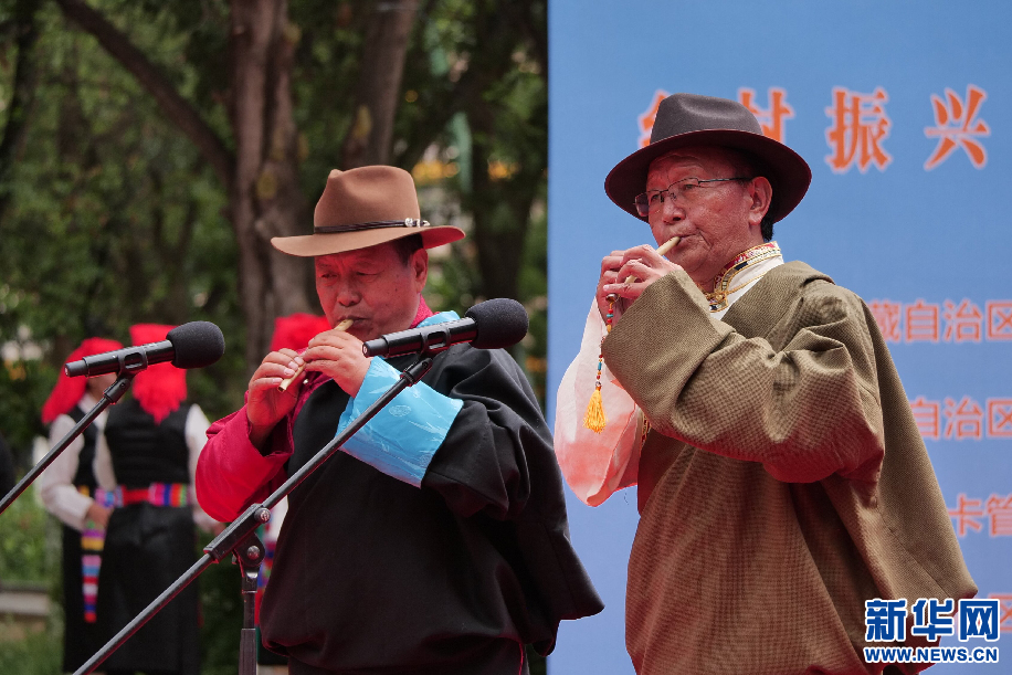 6月11日,鷹笛藝術自治區(qū)級代表性傳承人次旦和多吉在演奏《金剛山崖上的雄鷹》。新華網 旦增努布攝