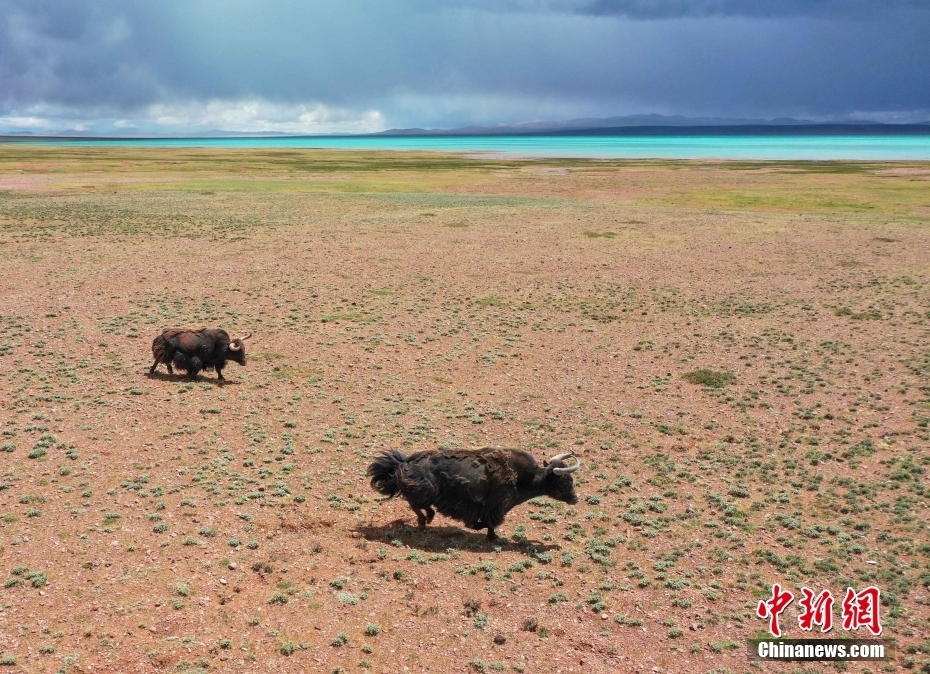 7月16日,西藏那曲羌塘草原上的野牦牛。羌塘草原位于西藏北部,是野生動(dòng)物的樂園。(無人機(jī)照片) 中新社記者 貢嘎來松 攝