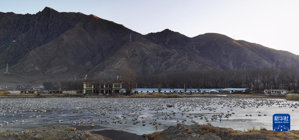 拉薩市林周縣邊交林鄉(xiāng)的池塘里,大量斑頭雁、赤麻鴨等候鳥棲息(12月24日攝,手機(jī)照片)。新華社記者 沈虹冰 攝