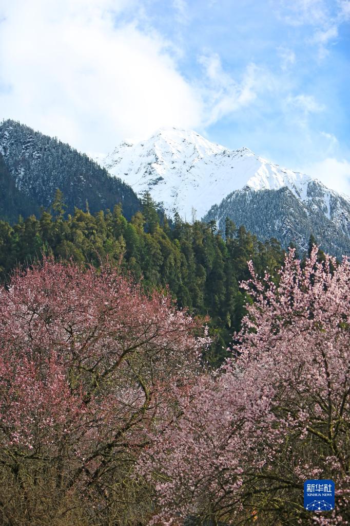 近日,林芝市波密縣古通村漫山遍野桃花盛開(kāi),與高原雪山相映成趣。