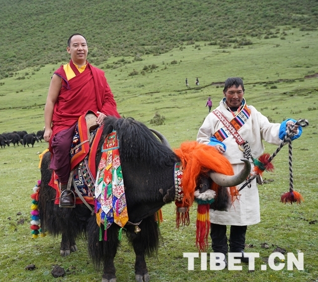 陽光雨露滋潤下,夏季的牧場上到處呈現(xiàn)出翠綠欲滴、生機勃勃的景致,鮮艷的野花與成群的牦牛更是給綠草如茵的牧場鑲嵌上靚麗的花邊??疾焱暄┝炙共寄翀鰧I(yè)合作社后,十一世班禪一行來到放牧點,考察調(diào)研夏季牧場放牧點等情況。在這里,十一世班禪即興策馬徐行,展現(xiàn)出活力青春、風華正茂的一面。