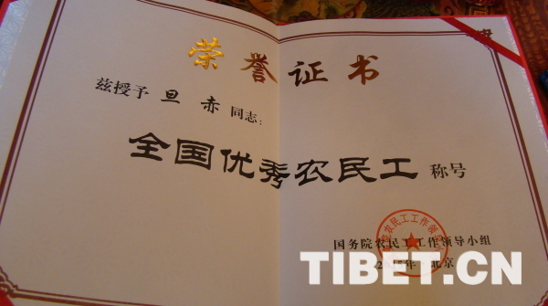 圖為旦赤獲得了“全國優(yōu)秀農(nóng)民工”稱號。