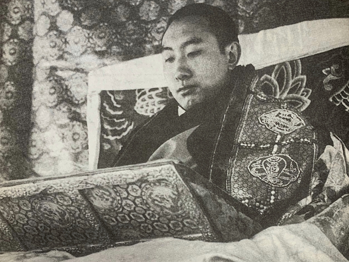 圖為十世班禪高坐扎什倫布寺法臺(tái)上講經(jīng)。(陳宗烈攝于一九五七年)