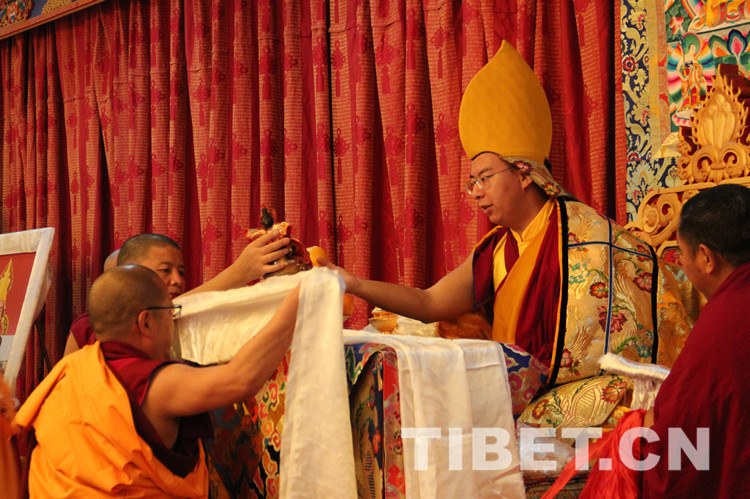 誦經(jīng)結(jié)束后,土多申格副院長帶領(lǐng)3名經(jīng)師代表和3名學(xué)員代表,向十一世班禪敬獻曼扎、佛像、佛塔、佛經(jīng),進行佛事禮拜。班禪微笑接過供奉,一一為其摸頂賜福。