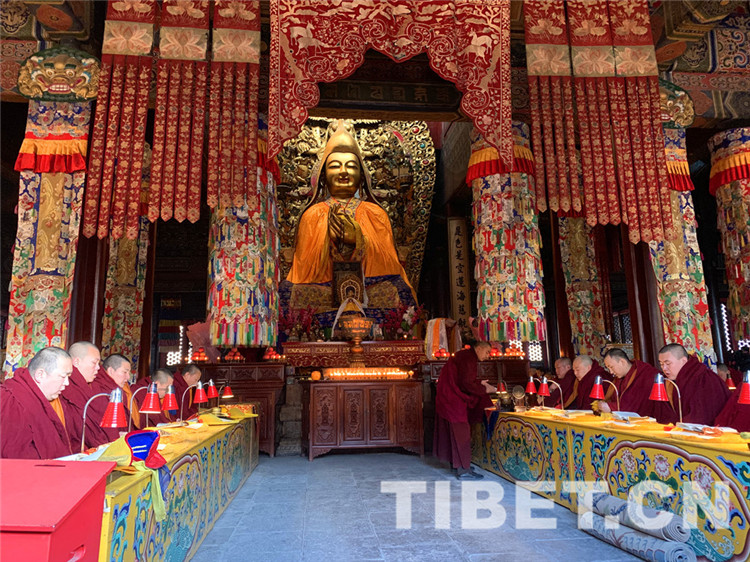十一世班禪口念經(jīng)文,百余位僧人身著戒衣,按順序分坐于大殿兩側(cè),跟隨大師虔誠詠誦《皈依發(fā)心》《文殊師利名贊》《十世班禪大師功德新祈禱詞》《回向祈禱詞》《十一世班禪大師常住世間法》《白度母贊》《釋教昌盛祈愿》,以及《興隆正法》《消除眾劫》《六時吉祥》等。
