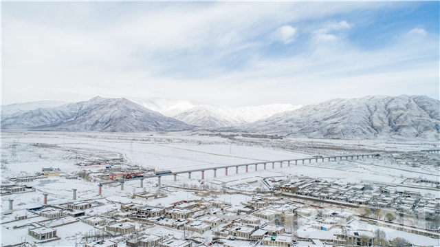 圖為拉林鐵路首座聲屏障橋梁穿過(guò)千年古鎮(zhèn)杰德秀