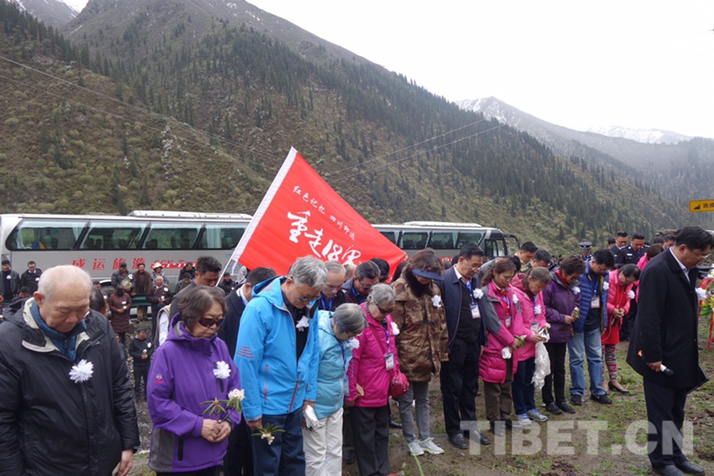 圖為十八軍老戰(zhàn)士和十八軍后代們在十八軍進藏的無名女兵墓前敬獻花籃并默哀