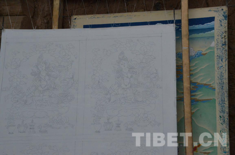 除了現(xiàn)場正在繪畫的3名學徒外,西熱秋久還有其他14名徒弟,他們大都是村里的建檔立卡戶。自2016年起,經(jīng)駐村工作隊和村“兩委”研討、建檔立卡戶同意后,最終扶持本村的致富帶頭人西熱秋久成立了唐卡繪制農(nóng)牧民專業(yè)合作社,定為村里的扶貧產(chǎn)業(yè),建檔立卡戶可以來此學習,成為學徒后在這里學習唐卡繪制,吃住都在這里并能獲得一定的工資。