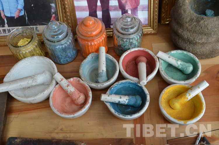 在門口的桌上,西熱秋久拿起一本泛黃的藏書籍向我們介紹,這是家中祖祖輩輩流傳下來的“繪畫標準”,里面記載了各類造像的比例。在學習繪制唐卡時,必須從造像的經(jīng)典比例入手,對人體結(jié)構(gòu)有所了解后,再開始衣飾形象的臨摹訓練,期間需要學習畫布、毛筆的制作,礦、植物顏料的研磨、泡制、使用等技巧。