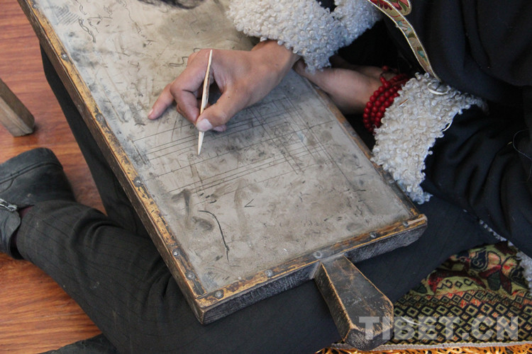 圖為桑昂然珠在木板上練習(xí)繪畫技法。這種木板上面先涂上墨水,再涂一層牛油,最后涂上牛糞燒成的灰,用削尖的木棍繪畫,畫過的痕跡可以擦掉反復(fù)使用 攝影:李元梅