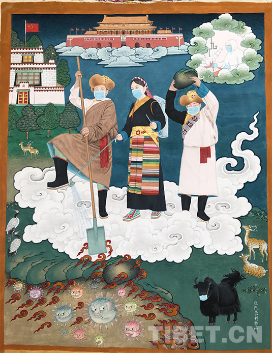 最終,旦巴云丹在畫布上通過5個(gè)部分的繪制展現(xiàn)唐卡主題:左上角藏式兩層獨(dú)棟小樓、正上方天安門、右上角科學(xué)家日夜奮戰(zhàn)、中間三位藏族民眾驅(qū)趕病毒、右下角野生動(dòng)物和人類和諧共處。