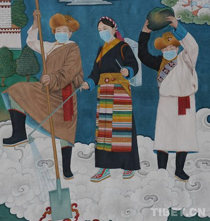 中國(guó)西藏網(wǎng)訊 一幅60cm*45cm的畫布上,一位身著藏族服飾的阿佳正戴著口罩噴灑消毒液。這并不是普通的繪畫作品,而是西藏唐卡畫師旦巴云丹耗時(shí)一個(gè)多月繪制的戰(zhàn)“疫”主題唐卡。